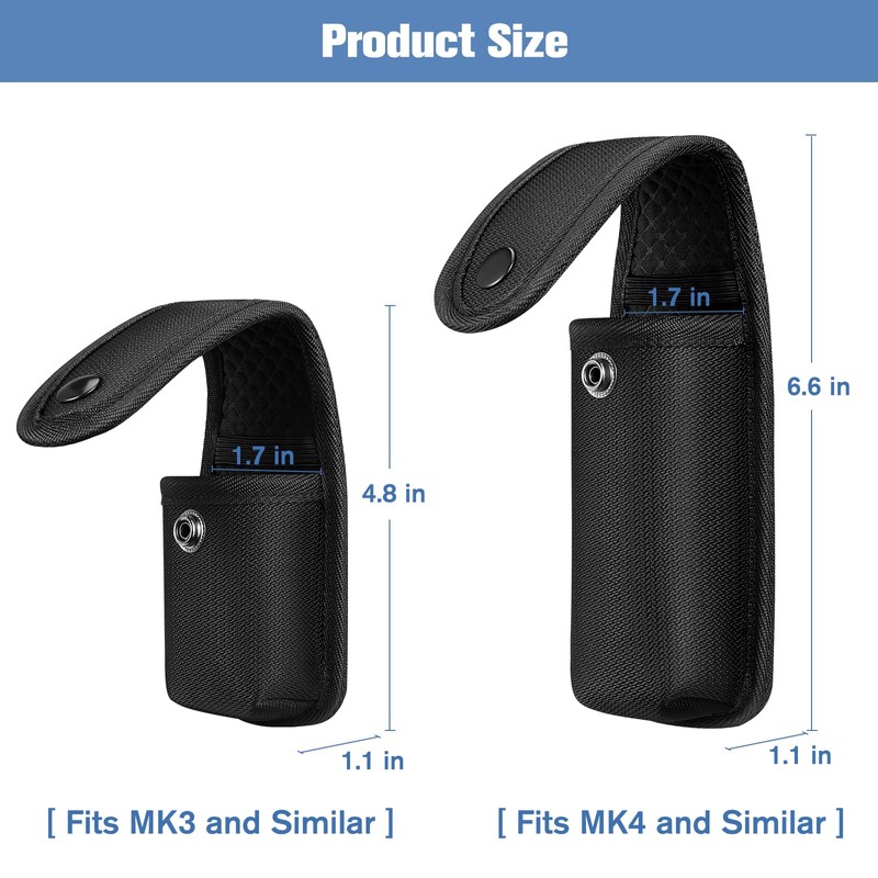 - The smaller size (Diameter: 1.7"; Height: 4.8") fits Defense Technology, Fury Tactical, MACE MK-2, MK-3 and similar canisters; the larger size (Diameter: 1.7"; Height: 6.6") fits Defense Technology, Fury Tactical, MACE MK-4 and similar canisters. (Pepper Spray Not Included.)