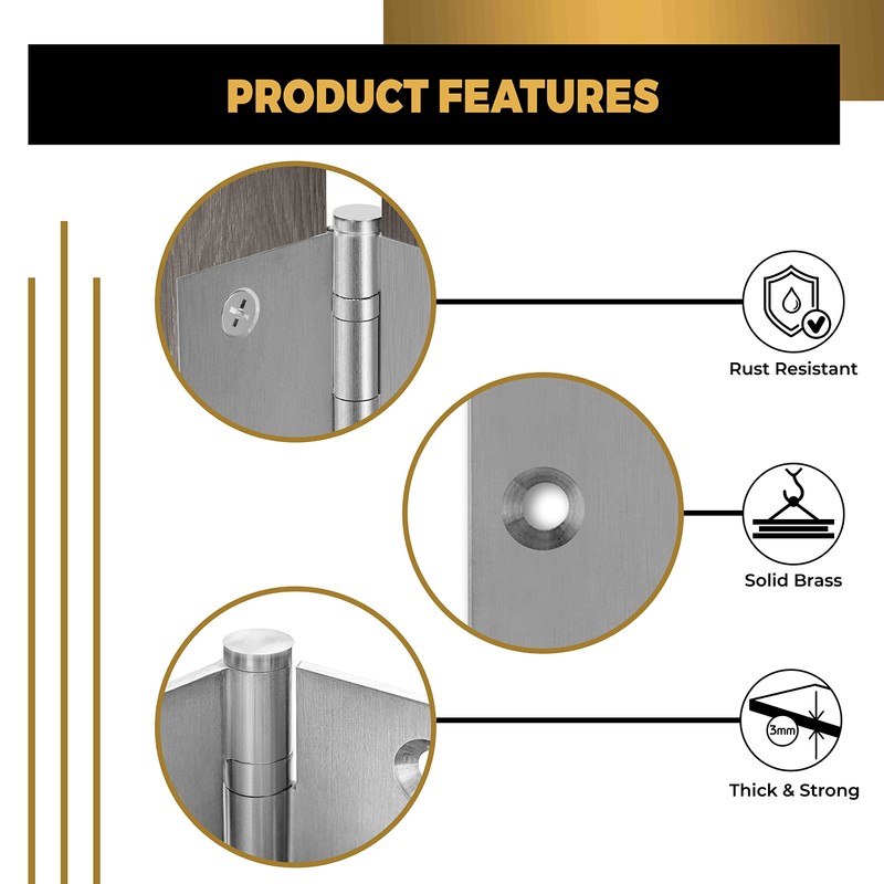 - QUALITY WORKMANSHIP - The hinges feature a bevel on the inside leaf, to ensure seamless and smooth closing of your door. The solid brass is highly resistant to outdoor rust, and the pin is made of rust-free stainless steel to ensure a smooth movement. Package includes: hinges, mounting screws, and flat tips.