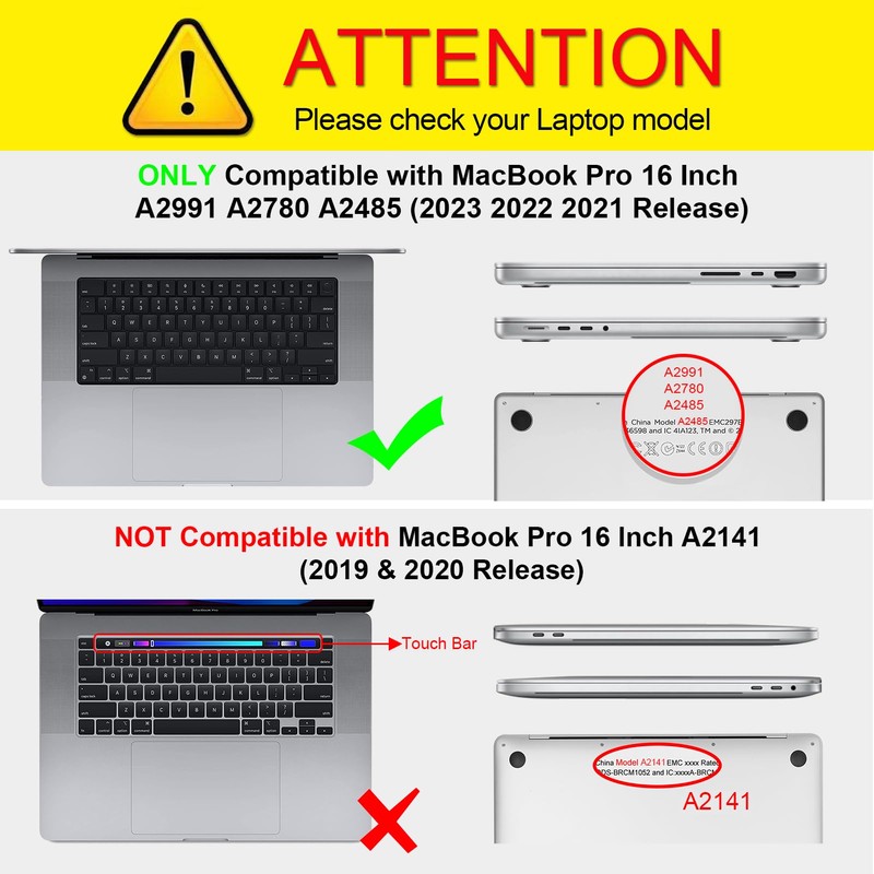 - Specifically designed for MacBook Pro 16 Inch 2021 2022 2023 Release A2485 A2780 A2991 M1 Pro / M1 Max / M2 Pro / M2 Max / M3 Pro / M3 Max Chip with Liquid Retina XDR Display & Touch ID. Not Compatible with other model laptops.