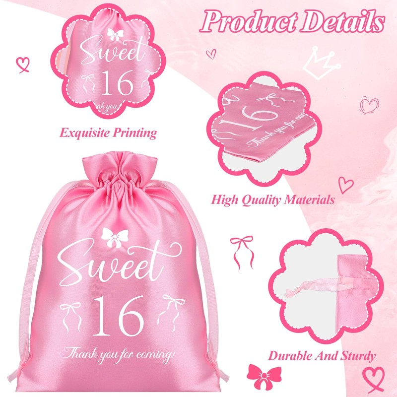 - 【Thoughtful Design】The pink silk drawstring bags are adorned with a charming "Sweet 16" and "Thank You for Coming" message, along with a delightful bow pattern, making them not only practical but also a memorable keepsake for your guests. The design is perfect for a 16-year-old's birthday party, leaving a lasting impression