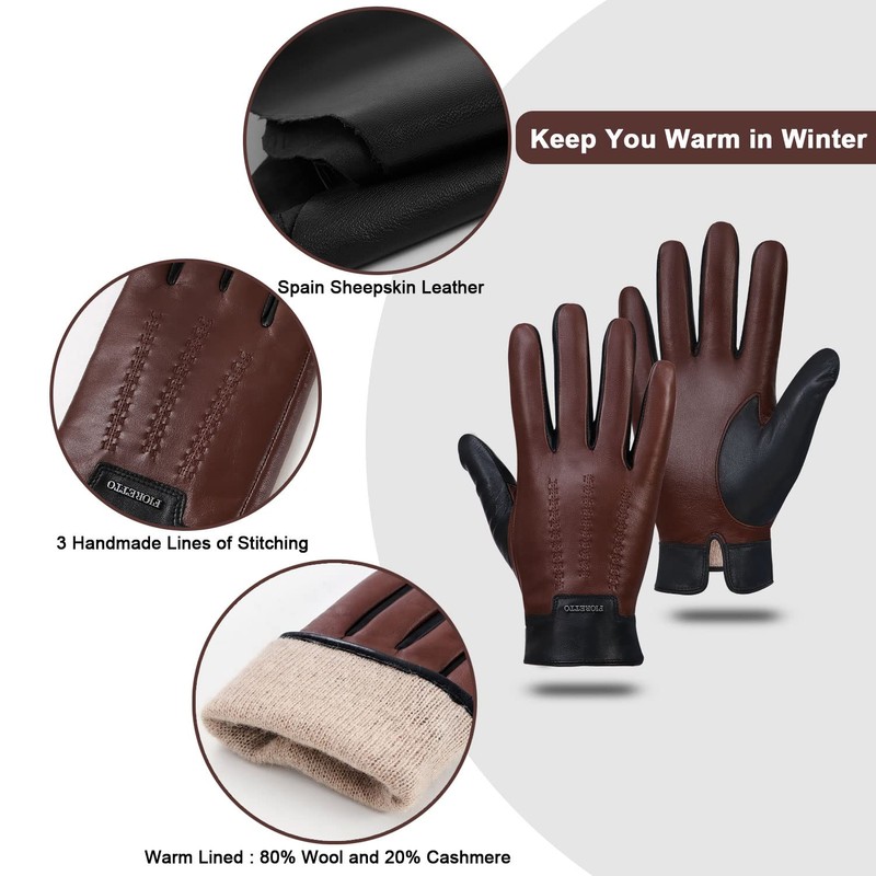 FIORETTO Mens Winter Genuine Leather Gloves Cashmere and Wool Lined Warm Touchscreen Leather Driving Gloves Brown Medium