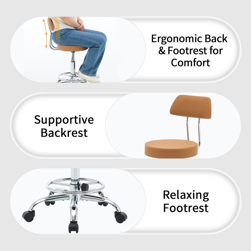 Our rolling stools with backrest and footrest provide enhanced comfort during extended sitting. The premium faux leather surface and high-density foam ensure long-lasting support, allowing you to work or sit for hours without feeling fatigued. The smooth-rolling wheels make it easy to move the stool, meeting your needs whether at home or in the workplace