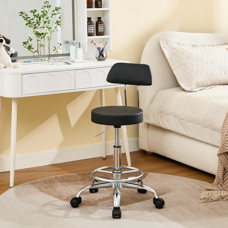 - Ergonomic Design. This stylish salon stool features a backrest and footrest that offers enhanced lumbar support and foot support, promoting proper posture during extended sitting. It helps reduce fatigue, making it ideal for long hours in settings like garages or workshops