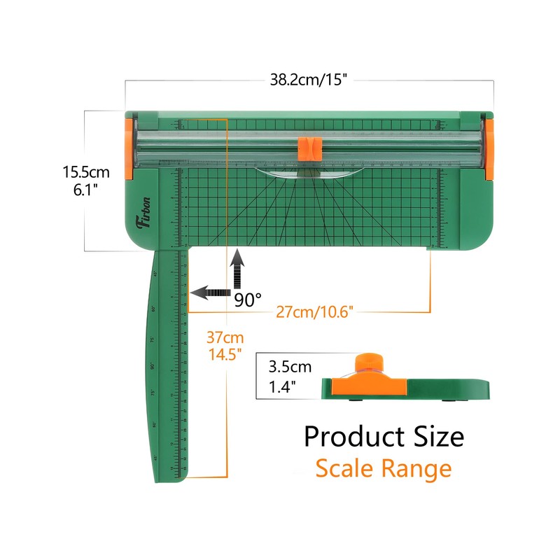 Equipped with extended ruler for easier placement of paper, angle measuring plate, and cm/inch grid scale for precise cutting.