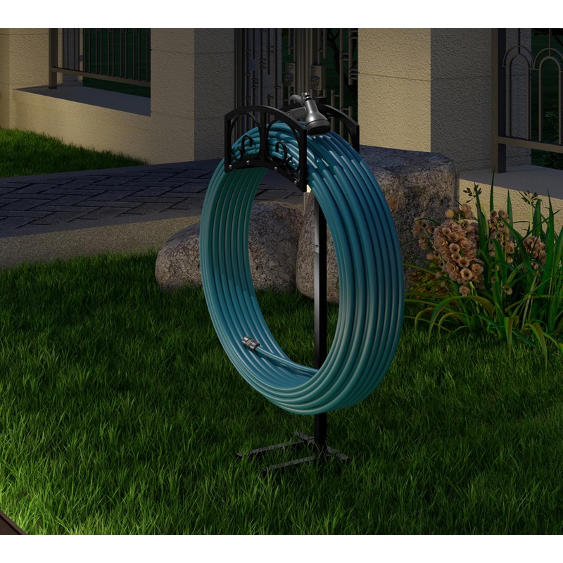 - Durable & Sturdy:Our garden hose stake is made of heavy-duty steel and black lacquer spraying technology to ensure the water hose organizer is rust-proof and durable.The screws are made of stainless steel to ensure rust and weather resistance.Wear-proof powder coating makes the surface of our stander thicker and sturdier to stay upright on the ground independently all the year round.