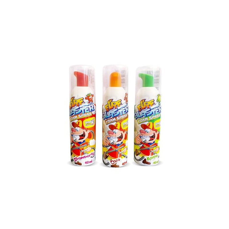 Fire Blaster Schaumspray 3er Set (3x40ml) – Aufschäumbare Fruchtschaum-Süßigkeit | 1x Apfel + 1x Cola + 1x Erdbeere in Feuerlöscheroptik | Für Mottopartys, Kindergeburtstage & Probierpaket