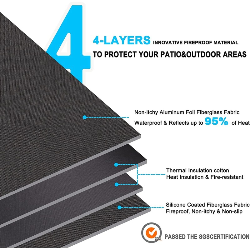Fire pit mat is made of 4-layer material, withstands high temperatures of up to 2000°F and has passed the test with the name SGS test (UL94 VTM-0 certified). The heat-resistant mat can protect floor, deck and lawn so that it can reduce the risk of fire when you use a BBQ grill shelf, a grill tray, a garden patio heater. Also is also waterproof and is also that water stains wet the floor.