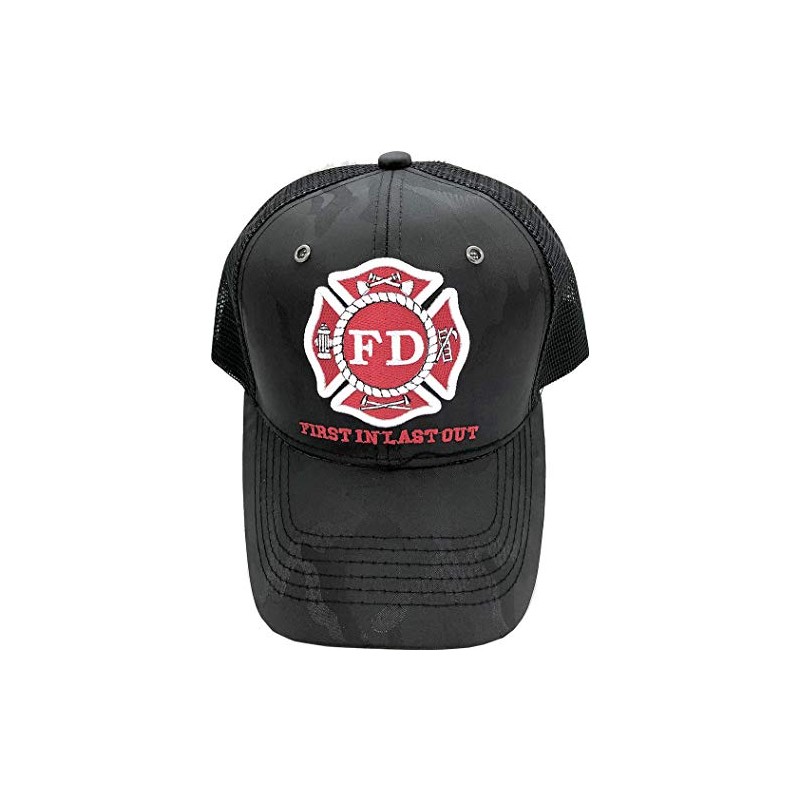 Fire Department - First in Last Out Fireman Officer Gear Uniform Baseball Cap Hat Adjustable, Black Camo With Mesh Back, One Size
