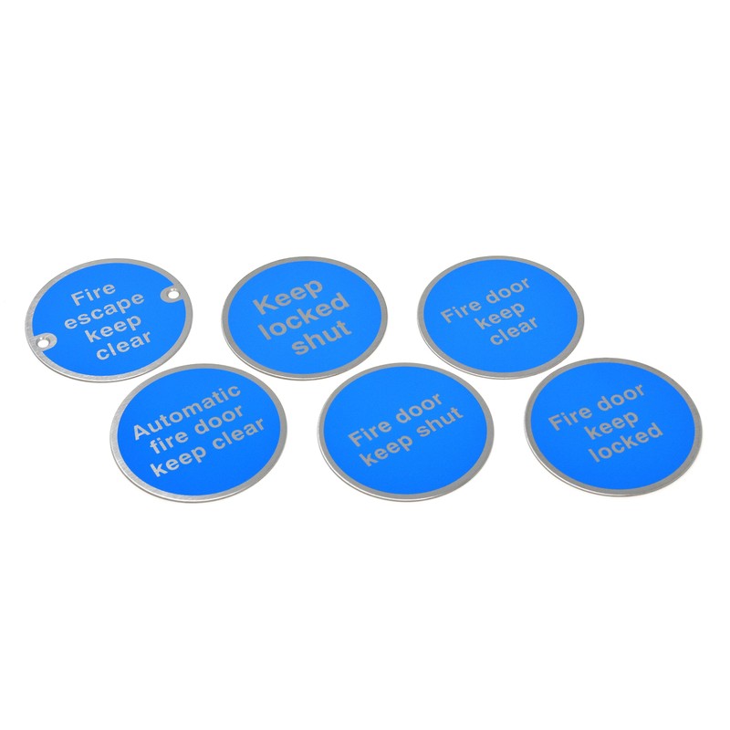 Fire Exit Signs, Disc, Door Signage, Satin Stainless Steel, Blue & Natural text (Automatic Fire Door Keep Clear - Drilled & Countersunk)