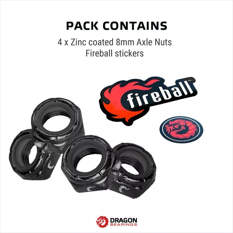 The high quality Fireball Dragon Axle Nuts have been designed to fit almost any brand of skateboard truck and manufactured to the highest standards in the industry. Coated with zinc, these steel nuts have been designed to last, and with correct installation offer strip resistance giving you one less thing to worry about when skating.