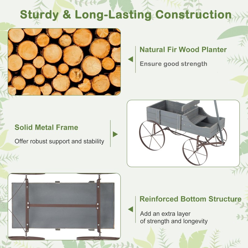 FIREFLOWERY Wooden Wagon Planter, Decorative Flower Pots w/ 2 Planting Sections, Wheels & Handle, Rustic Farmhouse Garden Planter Box for Patio, Yard, Porch (Grey)