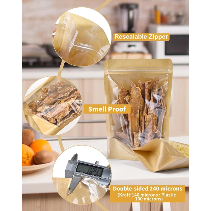 - 【Quantity & Material】Package include 100 pieces kraft stand up pouches. Outer dimension:4.7*7.9 inch,Inner dimension:4.1*4.9inch; Made from food grade kraft paper and plastic, which is odorless, reusable and moisture proof, keeps your products freshness.Practical bags for packing product.