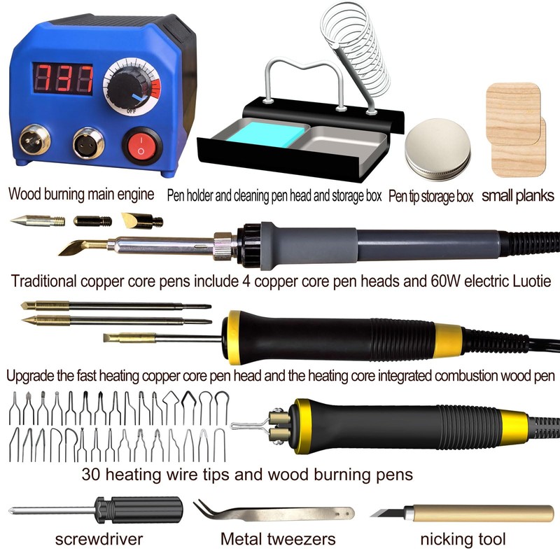 - Digital adjustable temperature wood burning ironing machine: The wood burning kit is suitable for 110V voltage and can be adjusted freely at 200-750 ℃. Can use two pens simultaneously or remove unused pens. Equipped with temperature digital display function. There are three different types of firewood burning pens with different functional characteristics for drawing. This includes a set of firewood burning pens with 30 wire nibs that quickly heat up in 3 seconds, a set of fine firewood burning pens with 3 solid copper nibs that quickly heat up in 1 minute, and a set of traditional firewood burning pens with 4 solid copper nibs that heat up in 3-5 minutes.