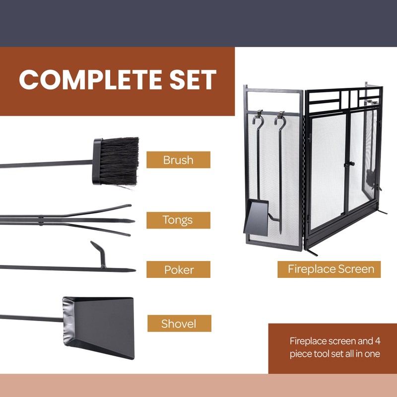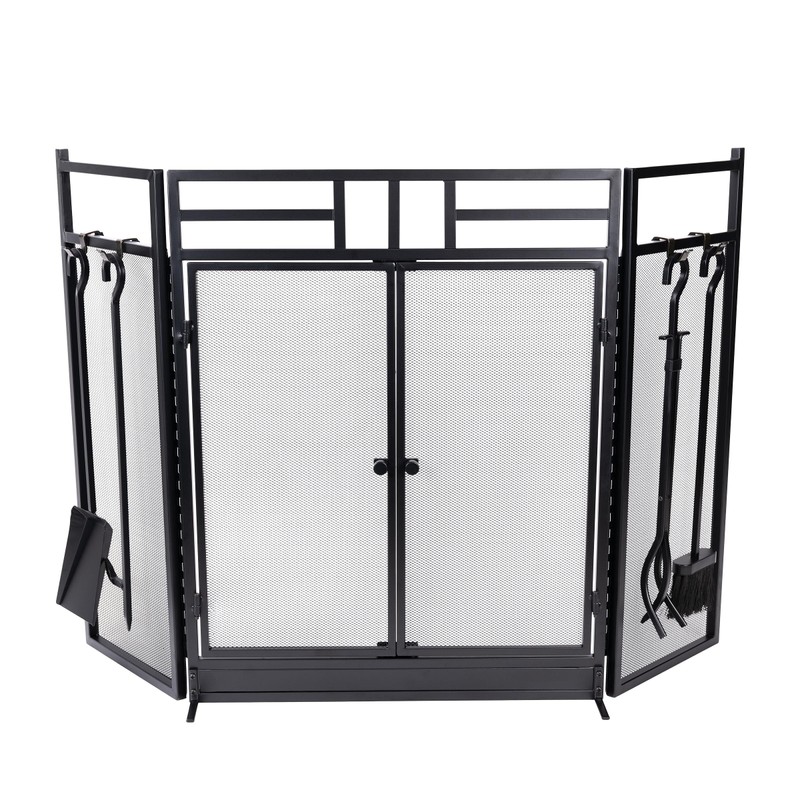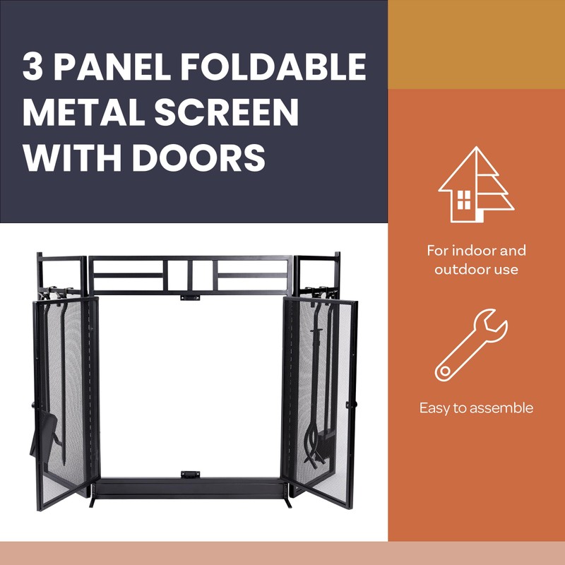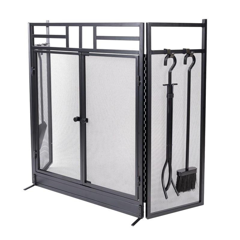 Fireplace Screen - 3 Panel Fireplace Gate with Fireplace Doors and 4PC Fire Place Tools Set with Poker, Tongs, Brush, and Shovel - Indoor/Outdoor Fireplace Covers by Lavish Home (Black)