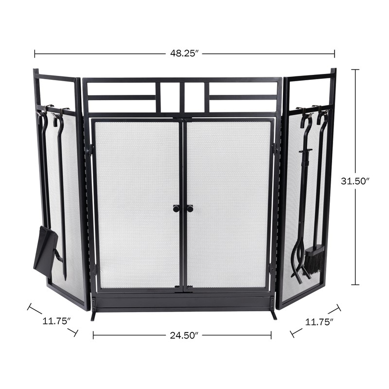 - PRODUCT DETAILS - Materials: Iron, Metal, and Mesh. Dimensions: (L) 25.39” x (W) 4.53” x (H) 32.28”. Product Weight: 27.34lbs. Includes: Fire Screen, Poker, Brush, Shovel, and Tongs. Color: Black.
