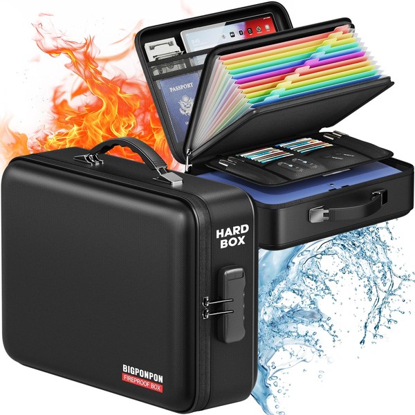 BigPonPon Fireproof Document Box, Hard Case Highly Flame-Resistant Fire Proof Waterproof File Organizer with Lock, Portable Fire Safe for Important Documents & Valuables Storage (Black, 15"*11"*5")