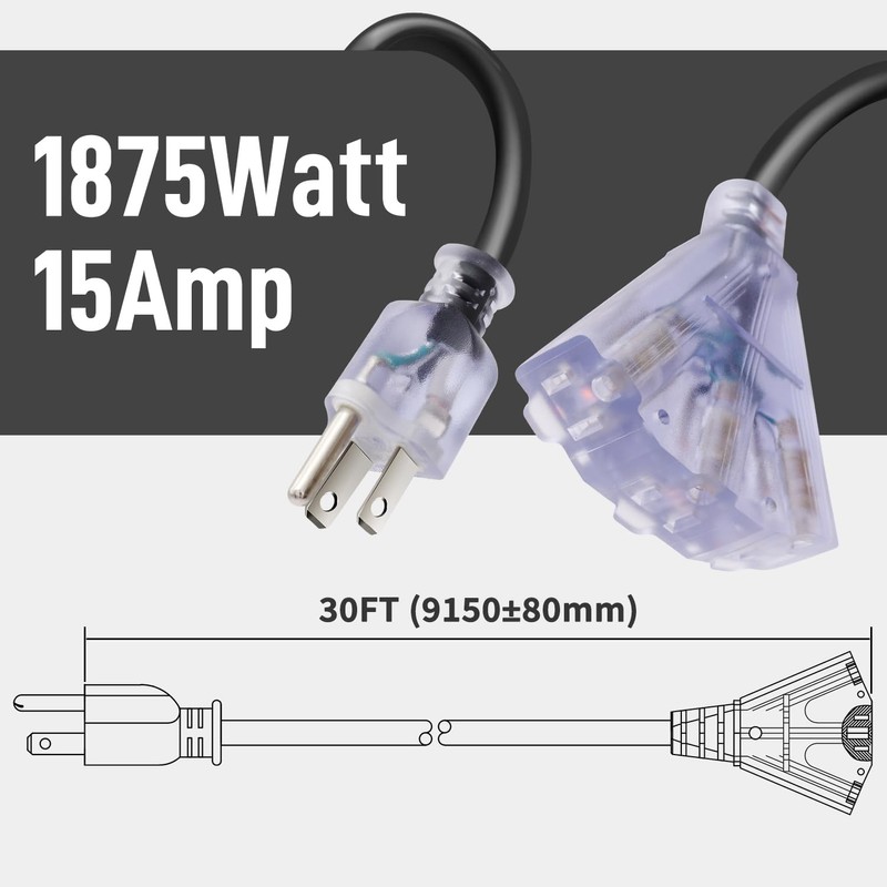 • SPECIFICATION: 30 Feet 3 Outlets Extension Cord, 3x14AWG, 15 Amp, 1875 Watt, 125 Volt, SJTW, black