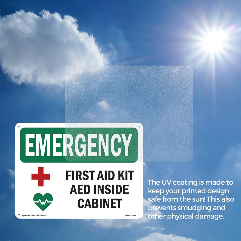 First Aid Kit AED Inside Cabinet With Symbol OSHA Emergency Aluminum Sign 10 Inch x 7 Inch - 5 Pack
