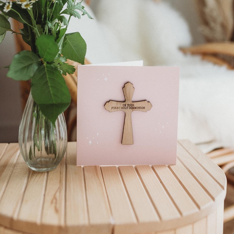 First Holy Communion Card for Boy with Removeable Wooden Cross Keepsake (Blue, First Holy Communion)