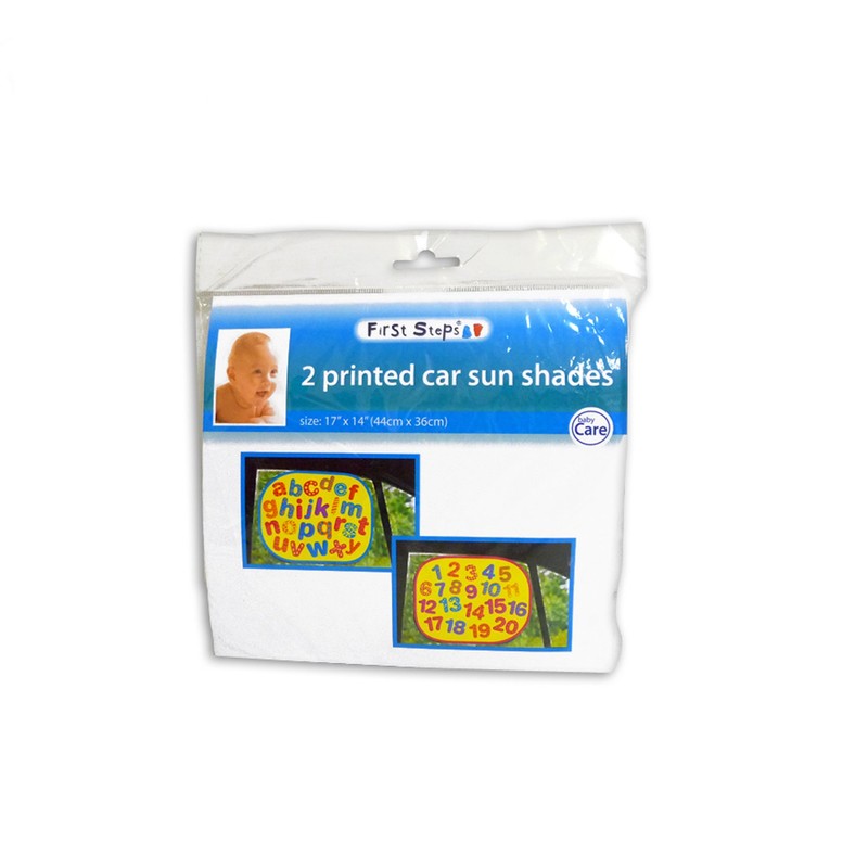 First Steps Pack of 2 Printed Car Sun Shades for Holiday & Travel Easy to Use Fun Learning for Child Baby Toddler