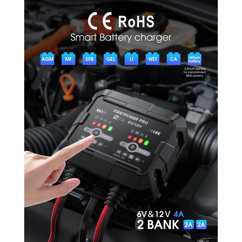 2-Bank, 4A (2A/Bank) Car Battery Charger, 6V/12V Trickle Charger, Battery Maintainer, Automotive Charger Float Charger for Motorcycle, ATV, Lead Acid and Lithium Batteries, Deep Cycle Batteries