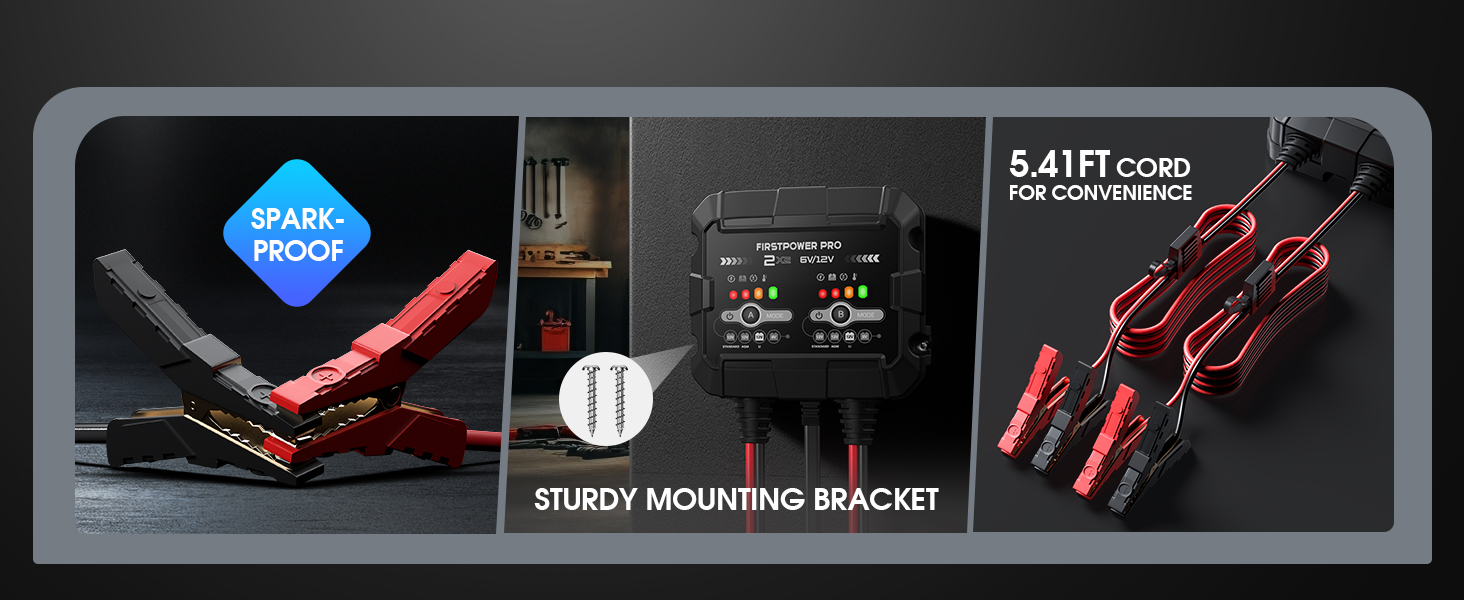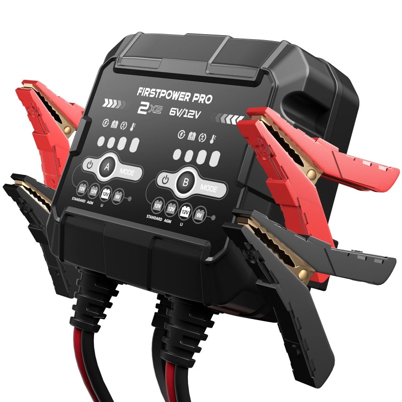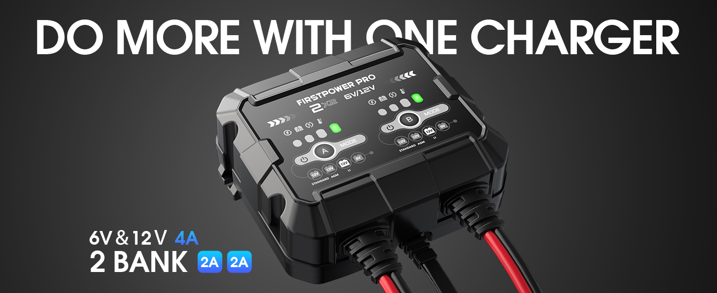 Multiple Banks: A two-bank battery charger maintainer rated at 4 amps (2 amps per bank) designed to charge and maintain various vehicles, including cars, motorcycles, ATVs, boats, RVs, trucks, lawn mowers, tractors, and more. Note: This is an all-in-one universal charging solution for 2 batteries—acting as a battery charger, maintainer, trickle charger, float charger, and battery desulfator.