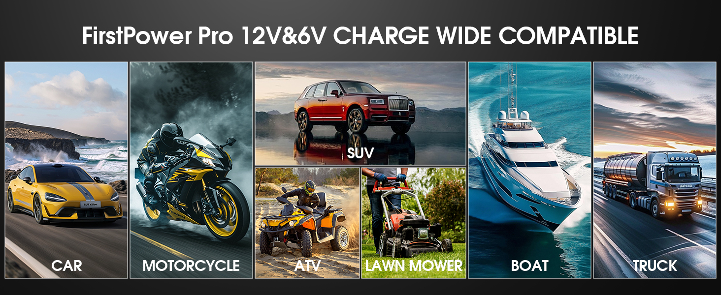Compatible with All Gas and Diesel Vehicles: Charge and maintain a wide range of vehicles, including cars, motorcycles, dirt bikes, scooters, lawn mowers, ATVs, UTVs, tractors, trucks, SUVs, RVs, campers, trailers, boats, PWCs, jet skis, snowmobiles, golf carts, classic cars, and more.