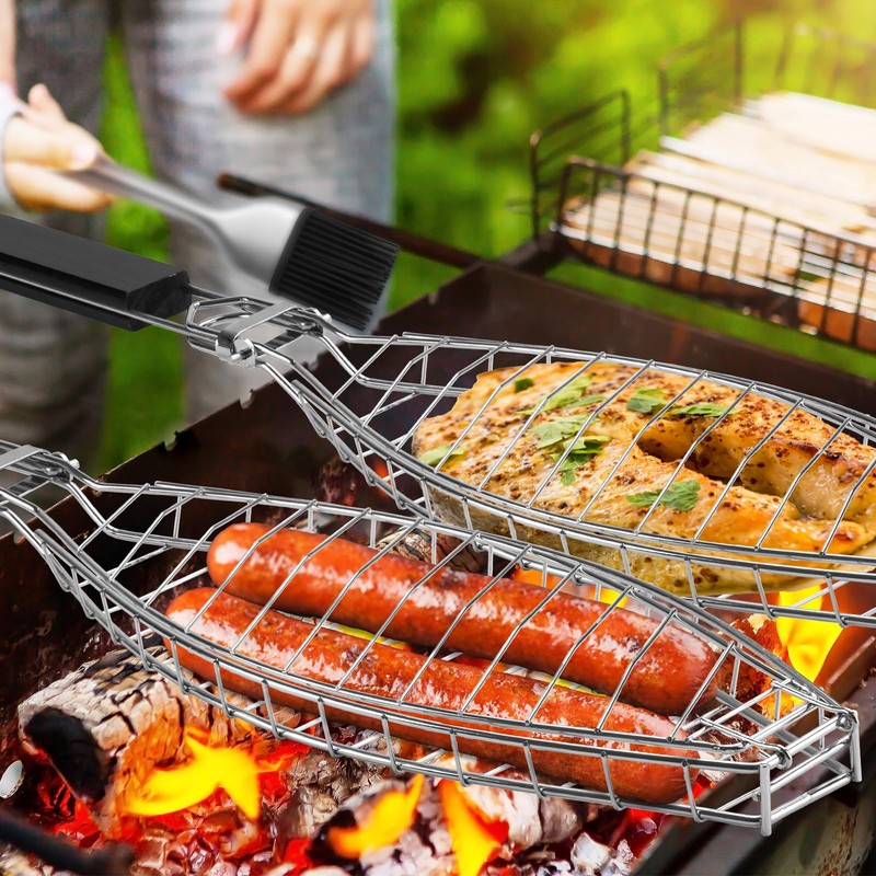 - Unique Fish-Shaped Design: This fish grill basket and basting brush are constructed from 430 food-grade stainless steel. They are reusable, durable, and rust-resistant, ensuring long-term use. The grilling area of the fish basket measures 35 x 15 x 2.5 cm