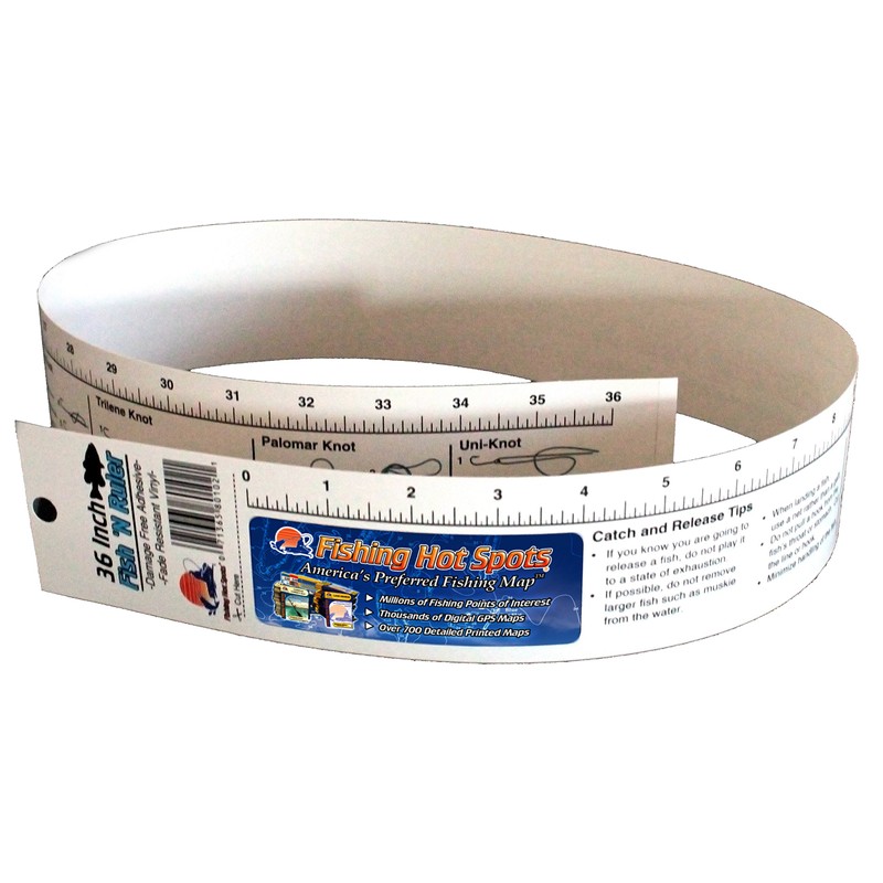- Measures fish to 36inches. Features easy-to-use unit conversions. Durable, adhesive backed vinyl attaches to boats, work benches or any clean flat surface.