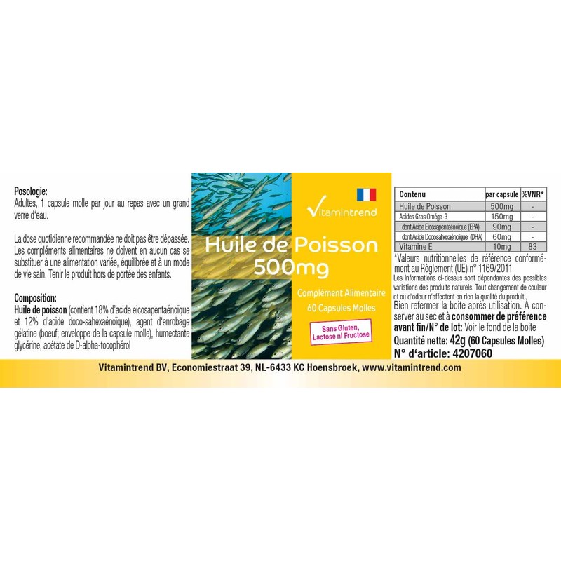 Fish Oil 500 mg - 60 Softgels, Natural Source of Omega-3 Fatty Acids, 18% EPA and 12% DHA, Safe Dosage Vitamintrend®