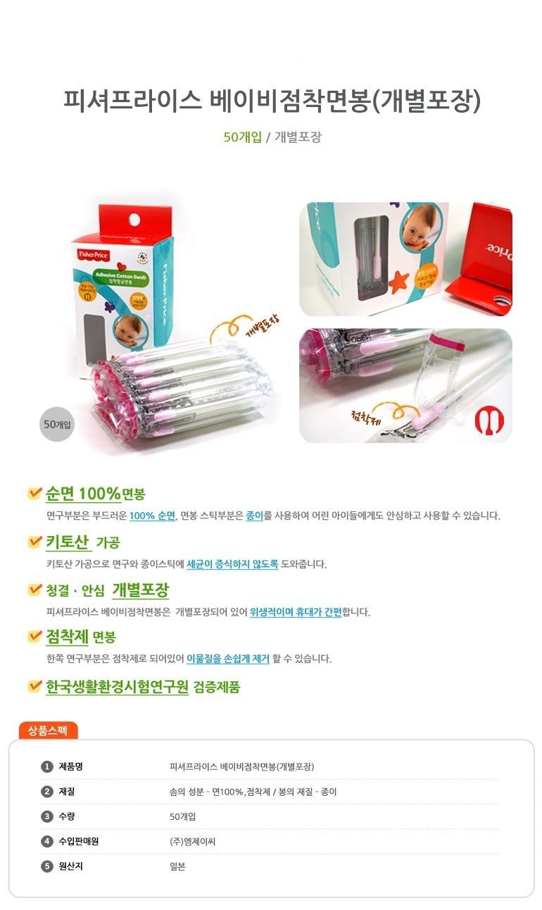 Fisher-Price Baby Adhesive Cotton Swabs (Individually Wrapped) / 피셔프라이스 베이비 점착면봉(개별포장)