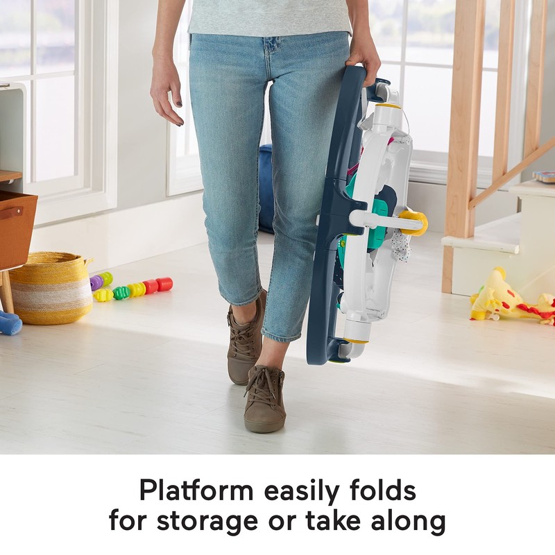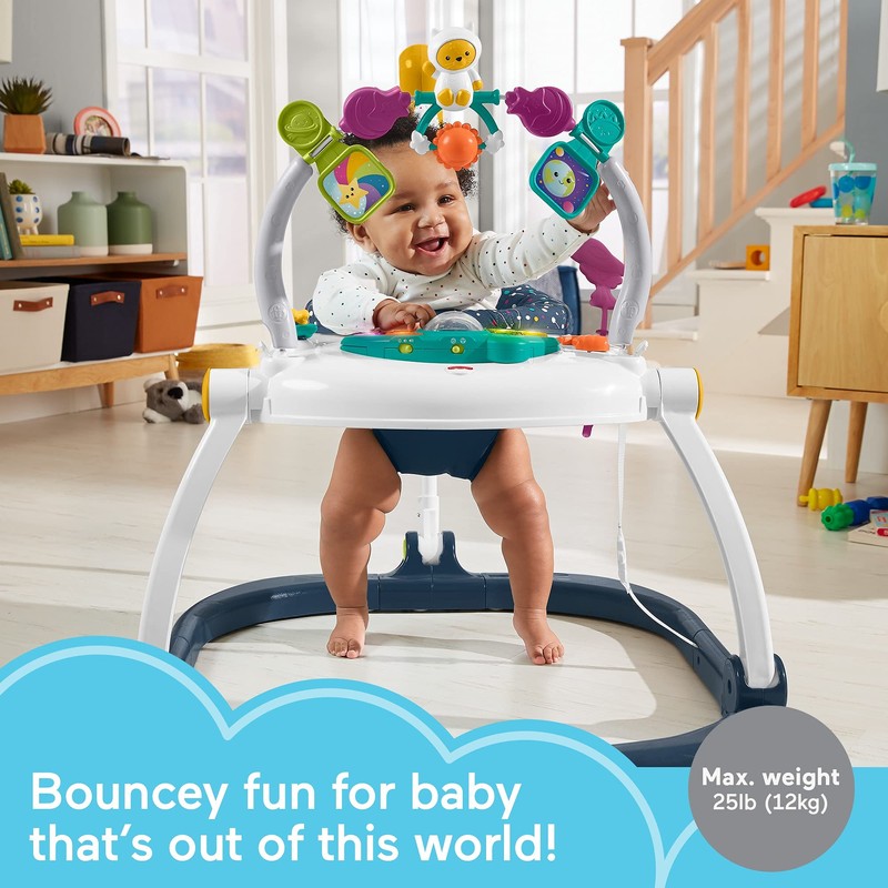 - Compact baby activity center with music, sounds, lights, and toys ready for bouncy fun