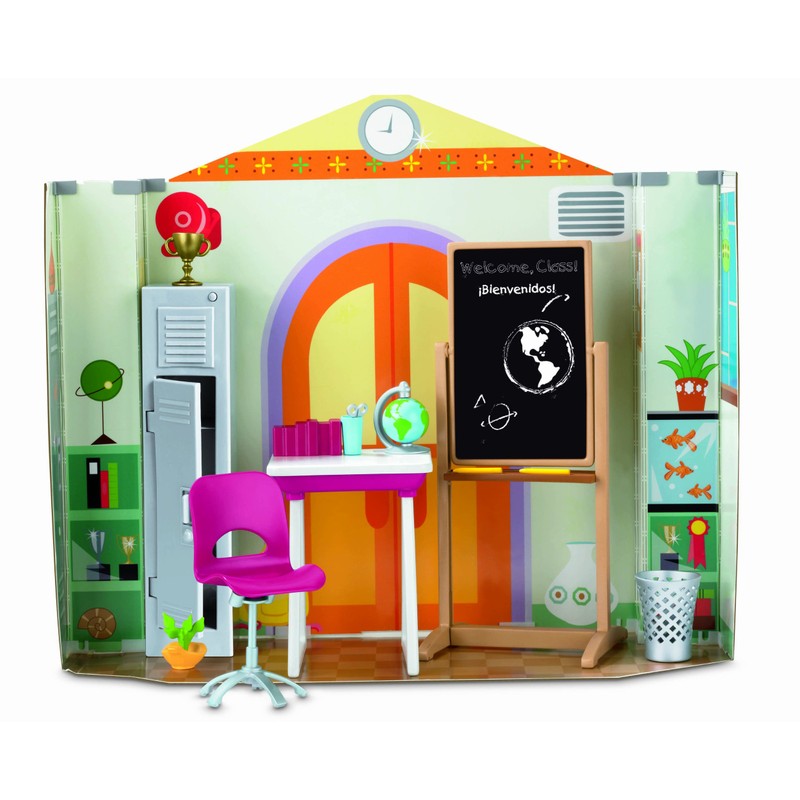 Now you can unlock Dora's school in the Online World of Dora's Explorer Girls! Puerto Verde School is in scale to any of the Dora's Explorer Girls dolls and comes with the following school accessories: Desk, Chair, Chalkboard, Locker, Pencil Cup, Pencils, Scissors, Plant, Garbage Can, Trophy, Books, and a Globe. To expand your online play, simply plug the locker into the computer with a USB cable (not included) and enter the Secret Explorer Girl code included - you will unlock activities, mysteries and new locations! PC-Compatible; Dora Links doll sold separately.