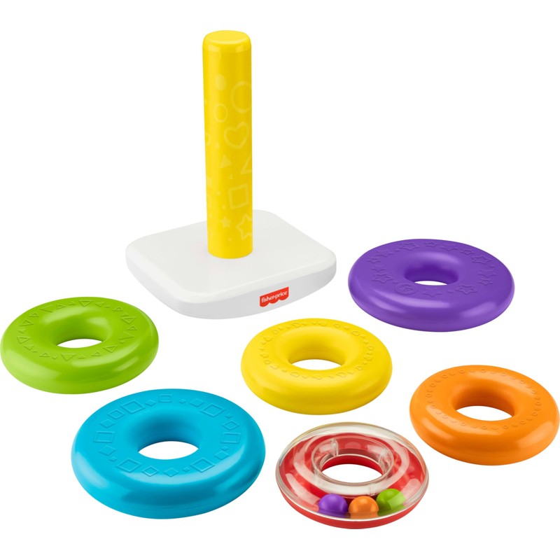 - 6 colorful rings for your baby to grasp, shake, stack, and explore