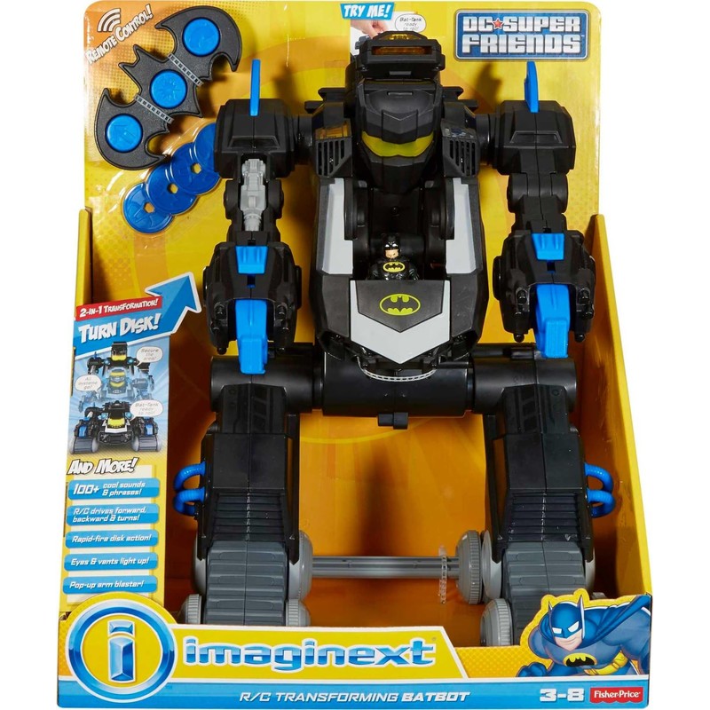 Includes Imaginext Transforming Bat Bot, Remote Control, Batman figure and four disks for launcher.