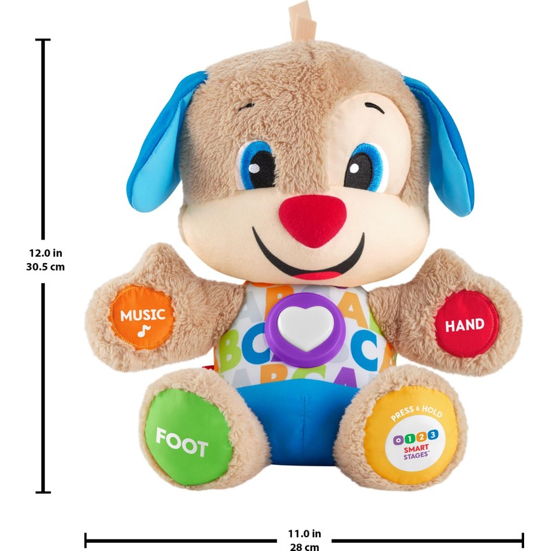 Say hello to your baby's first best friend; Puppy is soft, cuddly, and he's ready to make sure learning fun never ends. He responds to your baby's touch with exciting sing-along songs and phrases that introduce more than 100 first words, parts of the body, colors, shapes and more; And because every baby develops at their own pace, Puppy comes with Smart Stages technology, so you can choose the level that's best for your child. There are a variety of songs, sounds and phrases within each of the three levels of play. And Puppy's light- up, multicolor heart even twinkles along to the music; Level 1 – Explore – Baby can press Puppy's hands, foot, heart, nose or ear to hear first words, colors, the alphabet, parts of the body and more; Level 2 – Encourage – In this level, fun phrases reward little ones as they're encouraged to count along, find colors, and identify parts of the body; Level 3 – Pretend – Puppy's ready to play pretend with fun sing-along songs and phrases that engage toddlers in exciting and imaginative play, all while expanding their vocabulary!