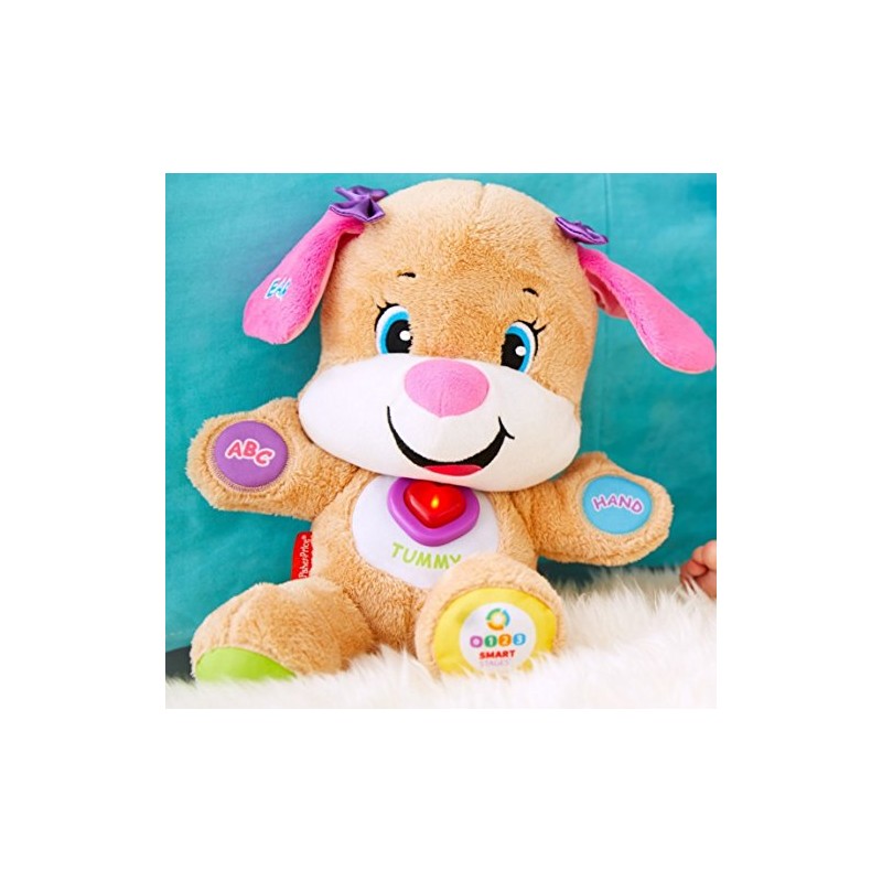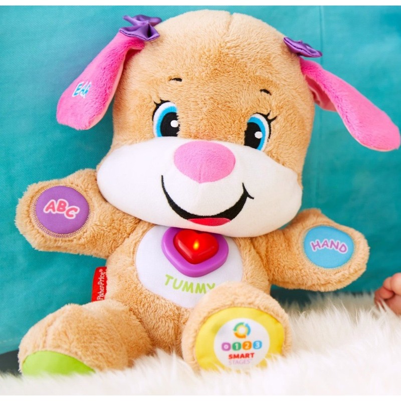 Responds to baby's touch with over 50 sing-along songs, tunes & phrases! Teaches body parts, shapes, colors, counting and more! She's the same soft, cuddly friend that responds to baby's touch with silly sayings and sing-along songs - but now Sis has Smart Stages technology that changes the learning content as baby grows! Because every baby develops at their own pace, Smart Stages technology gives you the ability to select the stage that's best for your child. There are a variety of developmentally appropriate songs, phrases and sounds within three levels of play. Sis' light-up heart even twinkles along to the music! Smart Stages Technology: Level 1 - Explore - 6M+ First words and sounds spark baby's curiosity; Level 2 - Encourage - 12M+ Prompt baby though questions and simple directions; Level 3 - Pretend - 18M+ Imaginative fun and early role play.