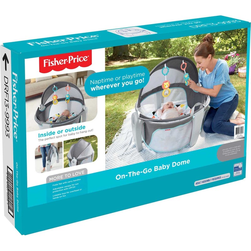 Baby feels right at home in the dome That's because it features a comfy pad for your little one to nap on or play on and a canopy that protects baby from sun and bugs. Use it indoors or out Two colorful toys dangle overhead to encourage eye tracking. The toys can be removed and placed within baby's reach for exploring the textures. And when you're ready to pick up and go again, just fold the dome and use the handles to take it with you It's a great take- along for camping, picnics, and a day at the beach, play dates, or a visit to grandma's house. Where development comes into play Security & Happiness: Soft padding and sun blocking visor help baby feel secure when away from home. Fine Motor: Dome includes link toys that will keep baby busy while strengthening and developing fine motor skills.