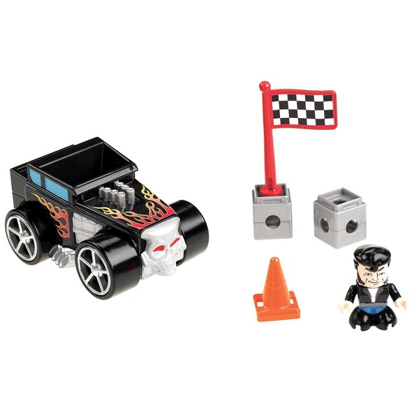 - The set includes: bricks, a Hot Wheels action figure, a car with chassis and a 2 wheel/axel set