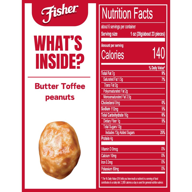 - Contains 6- 5.5 Ounce resealable pouches of Fisher Snack Butter Toffee Peanuts