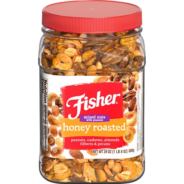 - Contains 1- 24 Ounce reusable canister of Fisher Snack Honey Roasted Mixed Nuts with Peanuts