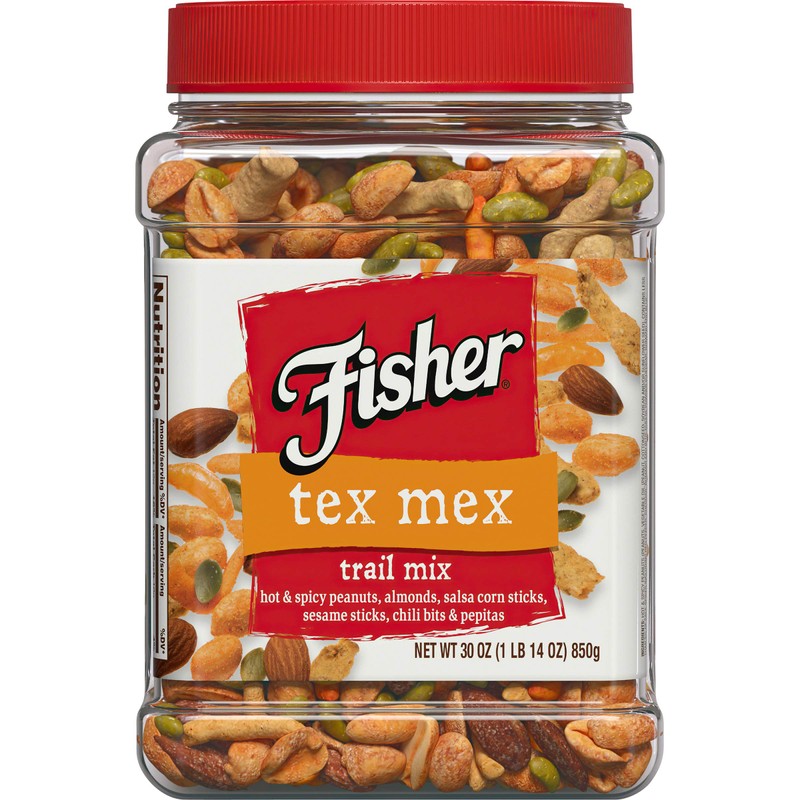 - Contains 1- 30 Ounce Reusable Canister of Fisher Snack Tex Mex Trail Mix