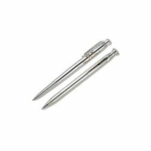 5.25" overall. Pocket clip. One each pen and pencil. PR4 black ink, medium point cartridge and .9mm lead. Writes upside down, at any angle, under water, over grease, and in extreme temperatures. Color: Chrome with Thunderbird engraving. Boxed.