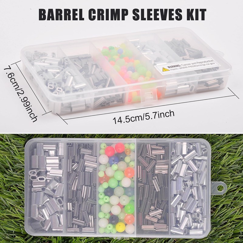 Crimping Sleeves Kit: 150pcs 1.4*2.9mm aluminum sleeves+100pcs 1.6*2.1mm copper double sleeves+100pcs 1.8*2.3mm copper double sleeves+50pcs 2.0*4.1mm aluminum sleeves+100pcs fishing beads