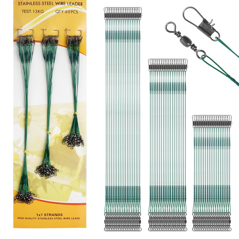 - 【FISHING LEADERS KIT】Including 60pcs fishing wire leaders, 20pcs/size, 6inch(15cm), 8inch(20cm), 10inch(25cm). Diameter: 0.02inch. Test: 13KG/29LB. Color: green / black / silver. Each length bundled together, it's easy to get individual leaders out to use.