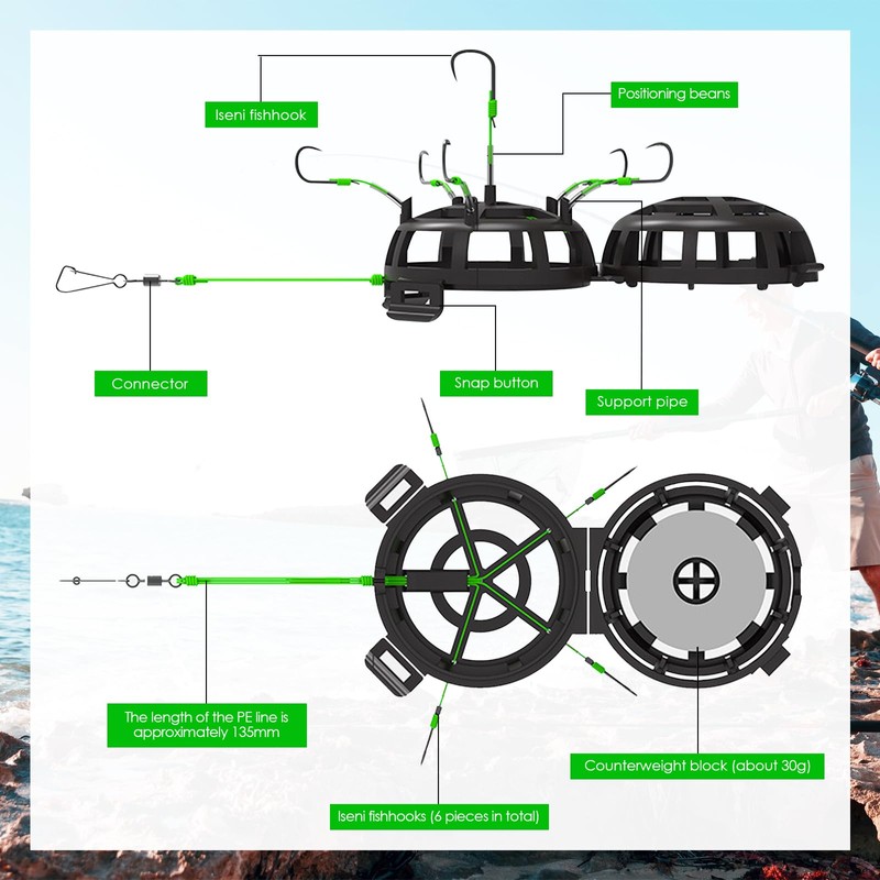 - 360° fishing: the upward bait cage hook holds the bait at the optimal angle to attract fish from all directions. The three-dimensional all-round fishing hook can display the bait at different angles, which can catch fish faster and increase the bite rate.