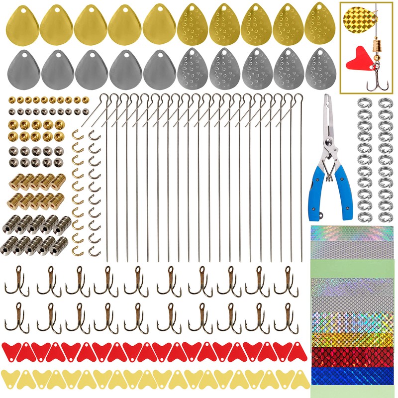 - 231PCS DIY LURE MAKING KIT: Includes 20pcs spinner blades, 20pcs treble hooks, 20pcs wire shaft, 20pcs clevises, 20pcs lure bodies, 40pcs beads, 1pc plier, 40pcs split rings,10pcs holographic adhesive film, 40pcs heart plastic sheet.