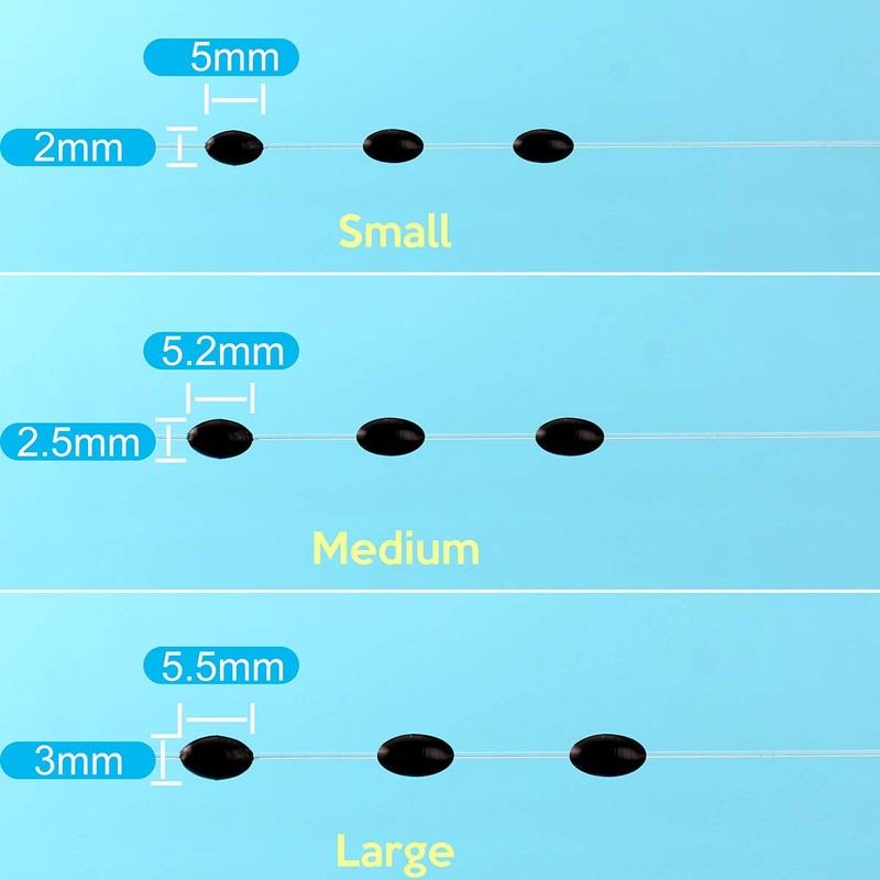 - This bobber stopper size: 3 sizes for choose, Small: For Line Diameters Between0.18 and 0.25 mm, Medium: For Line Diameters Between 0.19 and 0.30 mm, Large: For Line Diameters Between 0.30 and 0.39 mm,Perfect for fluorocarbon or other fishing line.
