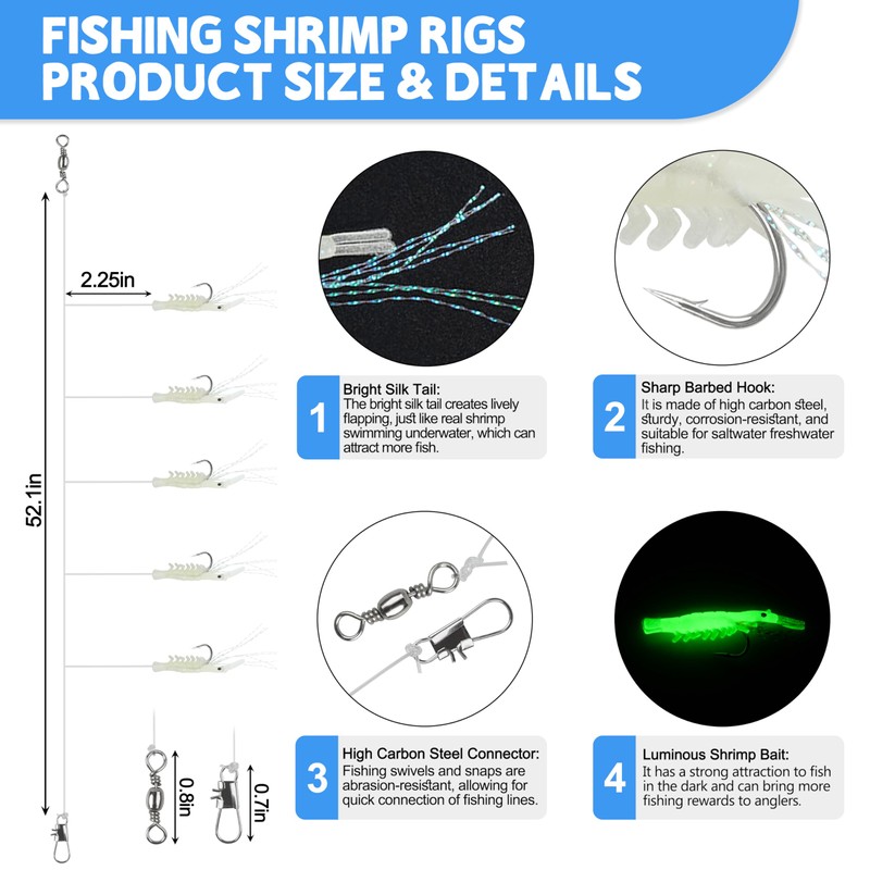 - Glow in The Dark: The luminous shrimp lure rig set is perfect for fishing at night. The luminous shrimp lure at night provides sensory stimulation for fish, helping you attract and capture more fish.