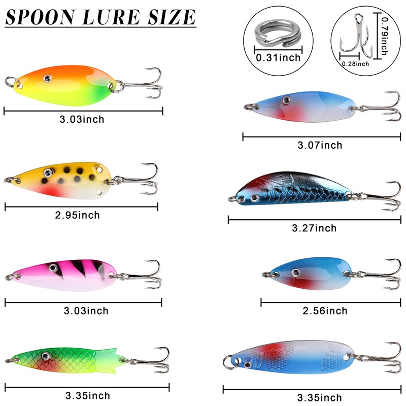 - Packing - 30PCS assorted casting metal spoon fishing lures,size range from 2.56inch to 3.35inch,it is very convenient for fishing trip.
